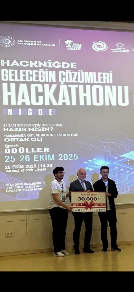 Bölümümüz 3. sınıf öğrencileri Kemal Hakkı Avsever ve Furkan Durmaz başkanlığında kurulan NevCode takımı, Niğde’deki yazılım yarışması HackNiğde’de birinci oldu. “Dezenformasyonla Mücadele” temalı yarışmada, NevCode’un yapay zekâ tabanlı “DetAI” çözümü, dijital ortamdaki yanlış bilgiyi tespit etme başarısı, kapsamlı sunumu ve sağlam prototipi ile jüriden tam not alarak birincilik ödülünün sahibi oldu.